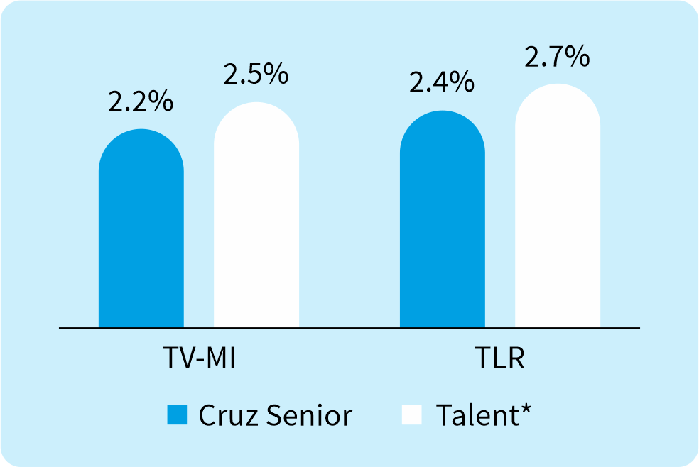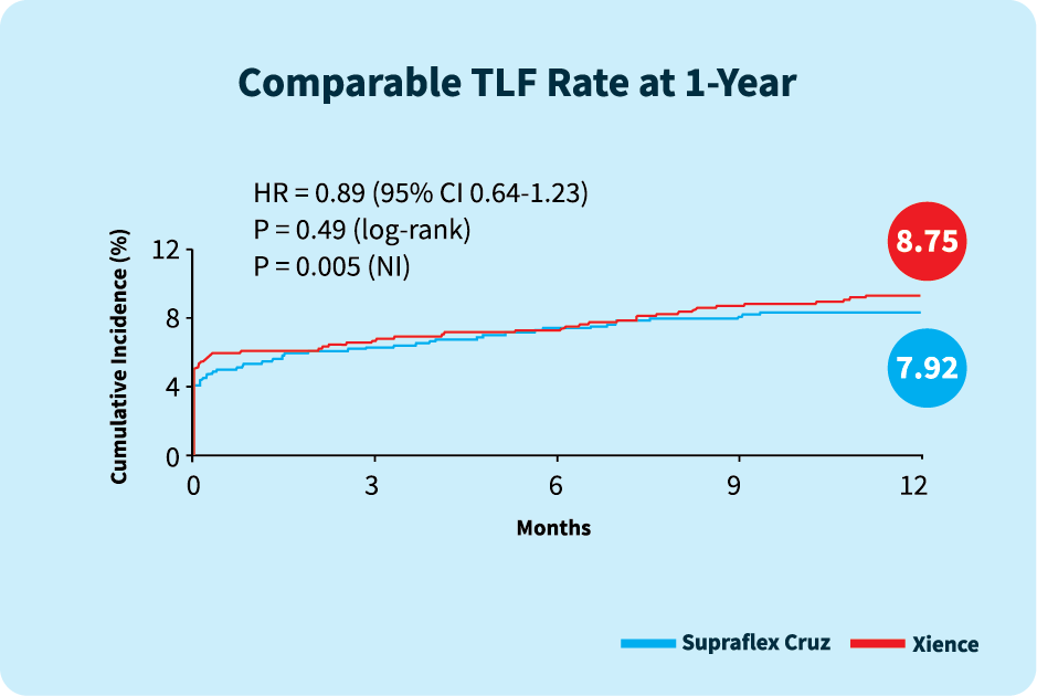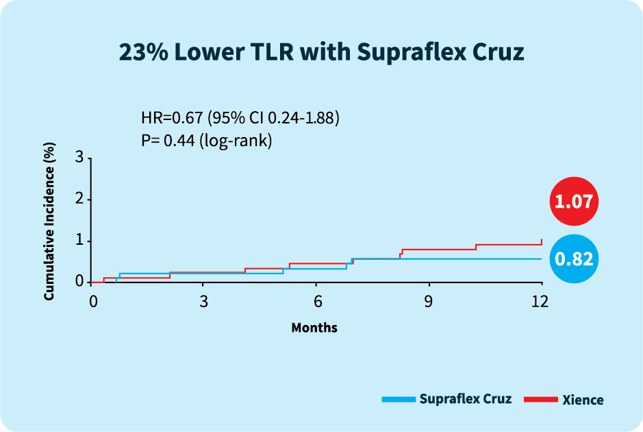 Supraflex Cruz demonstrated comparable clinical outcomes as Xience with 23% numerically lower incidence
