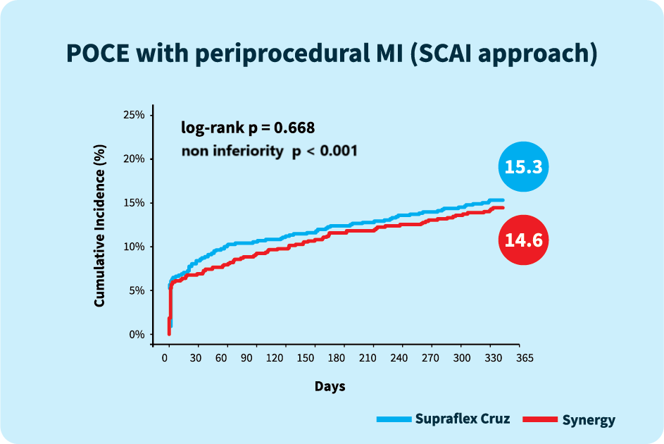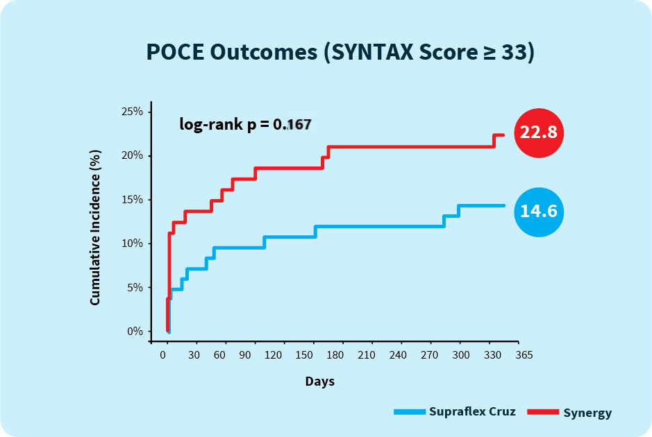 At 1-year, Supraflex Cruz demonstrated non-inferiority to Synergy, with a numerically lower rate of POCE Outcomes